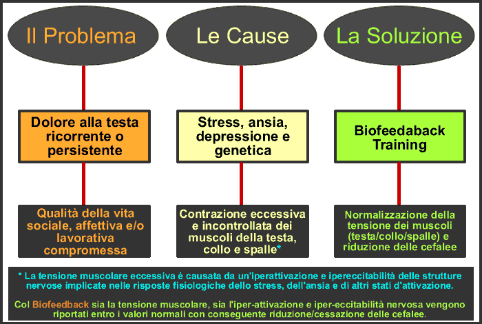 Il Biofeeedback è un trattamento psicofisiologico, un training grazie al quale l'individuo inverte il processo di sensibilizzazione delle vie nervose del dolore/sensoriali (interrompe il loop dolore ↔ tensione), attraverso la riduzione e l'eliminazione dell'eccessiva tensione muscolare inconsapevole che causa le cefalee e a normalizzare il livello d'attivazione neurofisiologica (legata all'ansia, allo stress e alla depressione) che alimenta il processo patologico.